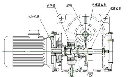 橫軸是將電機(jī)的動(dòng)力傳遞到立軸和轉(zhuǎn)鼓的主要部件。由電機(jī)、聯(lián)軸器、液力偶合器、傳動(dòng)軸、大螺旋齒輪和剎車輪等零件組成。其結(jié)構(gòu)緊湊,運(yùn)轉(zhuǎn)平穩(wěn)。采用液力偶合器傳動(dòng),同時(shí)起到過載保護(hù)作用。大螺旋齒輪在運(yùn)轉(zhuǎn)過程中連續(xù)不斷地將潤滑油飛濺到各傳動(dòng)軸承,使所有軸承得到很好的潤滑作用。