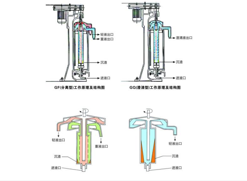 管式離心機(jī)的原理是通過離心力作用下,利用離心機(jī)產(chǎn)生的離心力將不同比重的物料從而進(jìn)行有效分離。依據(jù)不同的分離原理,管式離心機(jī)可分為澄清型(GQ)和分離型(GF)兩種,澄清型管式離心機(jī)的主要功能是處理液體和固體的兩項(xiàng)分離;分離型管式離心機(jī)的主要功能是處理液體于液體或者是液體、液體和固相兩項(xiàng)及三項(xiàng)分離。管式分離機(jī)由機(jī)身,傳動(dòng)裝置、轉(zhuǎn)鼓、集匯盤。進(jìn)液軸承座組成,轉(zhuǎn)鼓上部是撓性主軸,下部是阻尼軸承,電機(jī)通過傳動(dòng),從而使轉(zhuǎn)鼓自身軸線高速旋轉(zhuǎn),在轉(zhuǎn)鼓內(nèi)部形成強(qiáng)大的離心力場,物料有底部進(jìn)液口射入,轉(zhuǎn)鼓離心力促使料液沿轉(zhuǎn)鼓內(nèi)壁向上流動(dòng),使料液按不同組分的密度差,促使其分層,從液盤出口流出的。