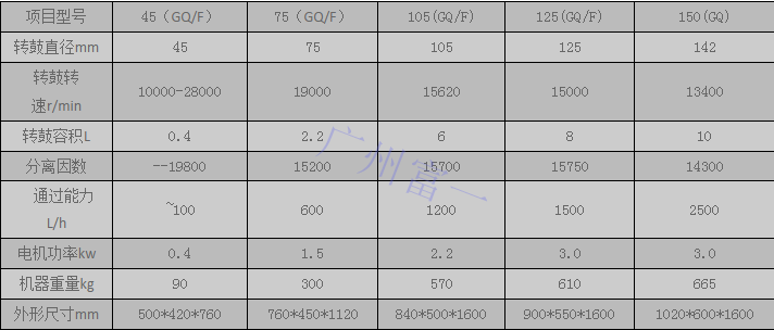 而廣州富一生產的管式離心機,就是屬于高速離心機,從管式離心機的參數(shù)中,可以明顯看到,轉速都是在10000r/min只上。
