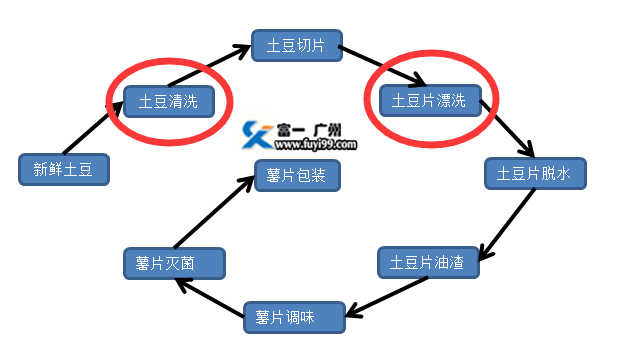薯片的生產(chǎn)流程大概如下圖所示。在整個(gè)過程中,土豆清洗和土豆片漂洗所生產(chǎn)的廢水是2個(gè)比較難處里的廢水。
