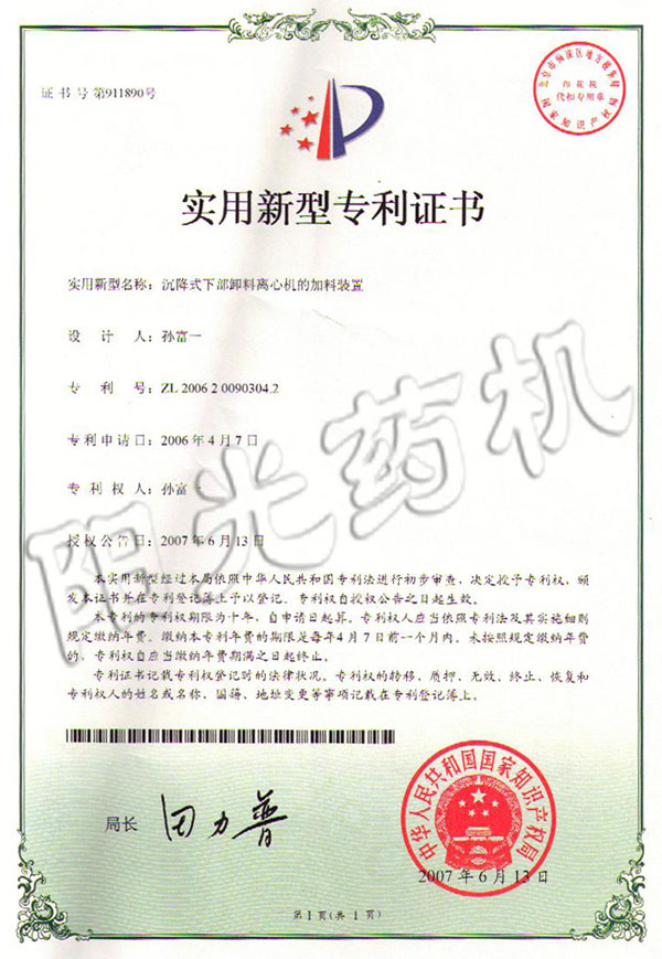 沉降式下部卸料離心機(jī)的加料裝置專利證書