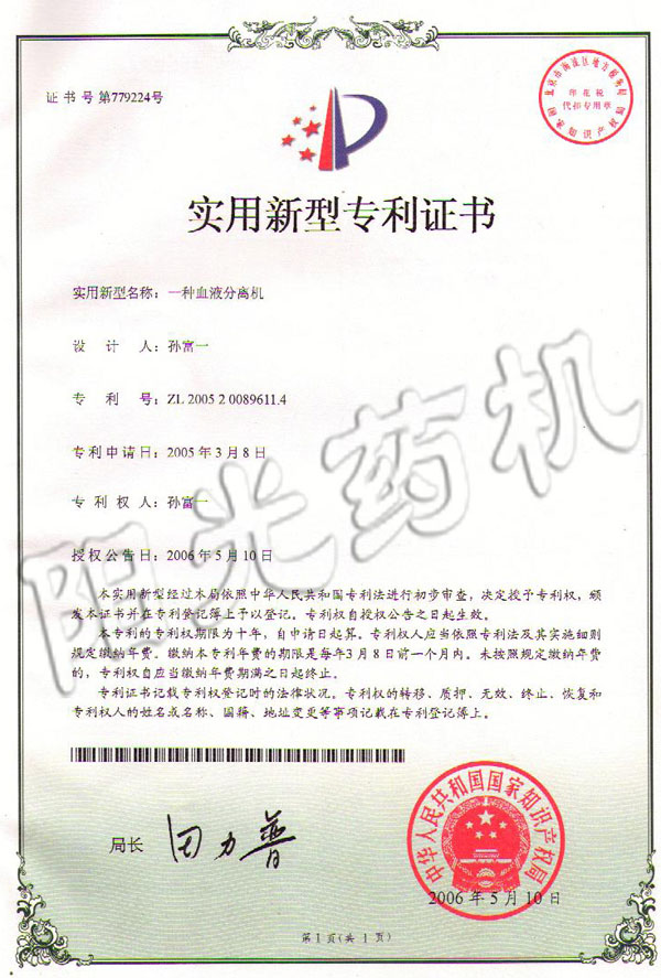 一種血液分離機(jī)專利證書